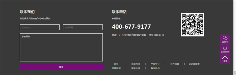 從網(wǎng)頁(yè)頂部導(dǎo)航欄“聯(lián)系我們”到底部增設(shè)的多渠道咨詢服務(wù),用戶可以從400服務(wù)熱線、在線咨詢、留言與我們聯(lián)系,我們將針對(duì)不同用戶的需求,打造專屬方案和服務(wù)。用戶還可通過手機(jī)掃描網(wǎng)頁(yè)底部的二維碼關(guān)注嘉麗士公眾號(hào),定期獲取嘉麗士最新資訊。此外,新官網(wǎng)還開設(shè)了合作招募通道,面向全國(guó)誠(chéng)招合伙人,攜手共建美好未來!